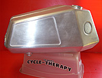1974 Honda CR 250 Elsinore1974 Honda CR 250 Elsinore tanks require more time than other gas tanks. The tank on this iconic vintage motocrosser is a closely scrutinized focal point. A lot of detail during the refinishing goes into each tank before its final clear coat to insure it looks as it did originally. You deserve to have the perfect tank on your Honda Elsinore and Cycle Therapy will be sure you get it.